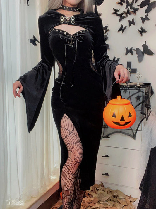 Women's Dresses Halloween Solid Drawstring Party Hooded Trumpet Sleeve Dresses