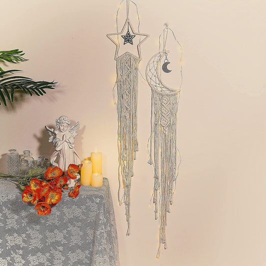 Moon Star Bohemian Dream Catcher Macrame Wall Hanging Art Woven Boho Wall Decor Home Decor Room Decor Gifts For Women, Gifts For Mom, Gifts For Lover, Gifts For Grandma, Beige,2pcs