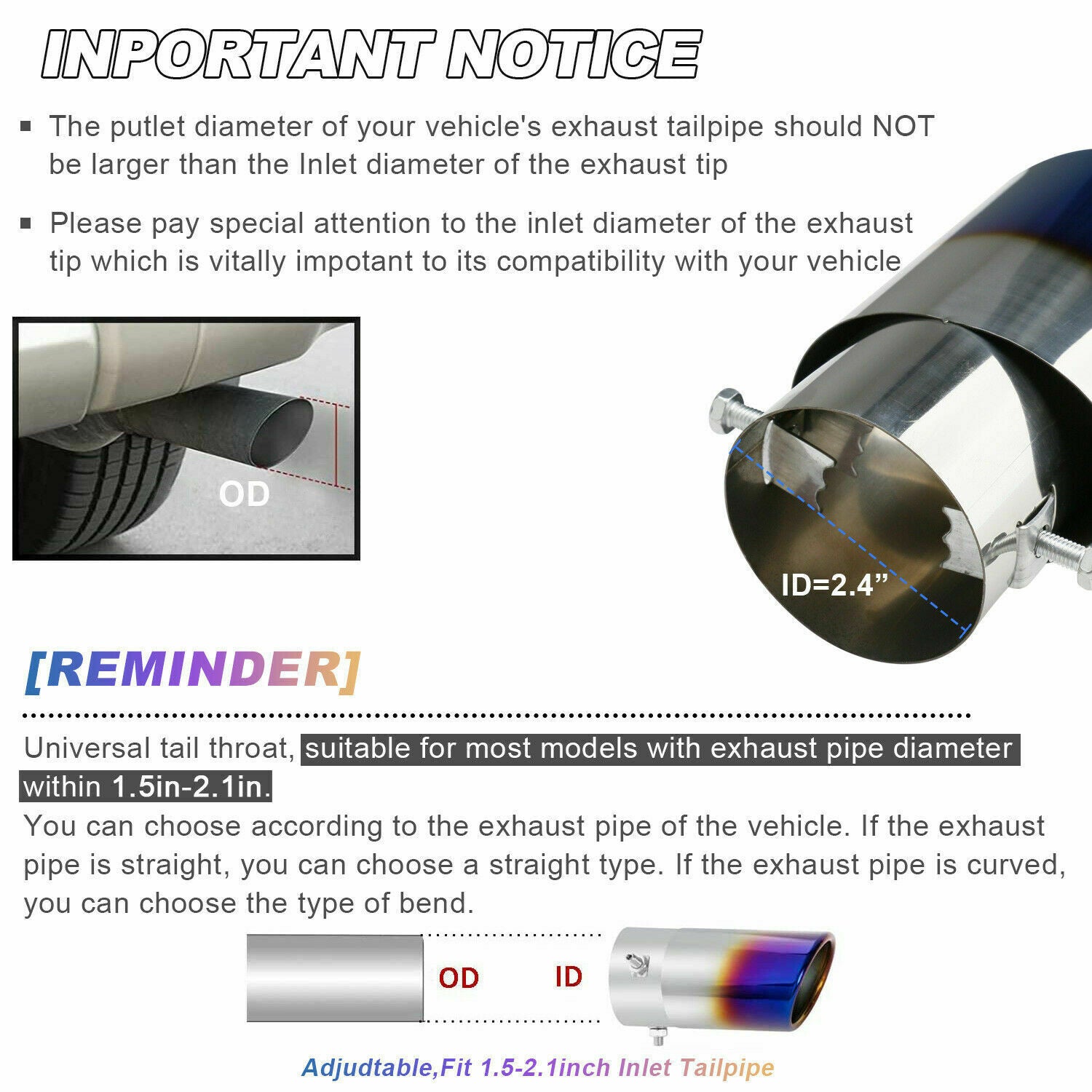 Car Exhaust Pipe Tip Rear Tail Throat Muffler Stainless Steel Round Accessories